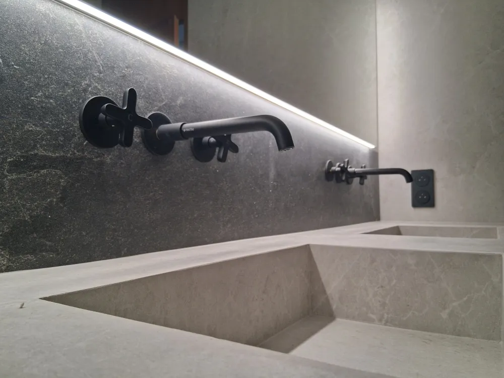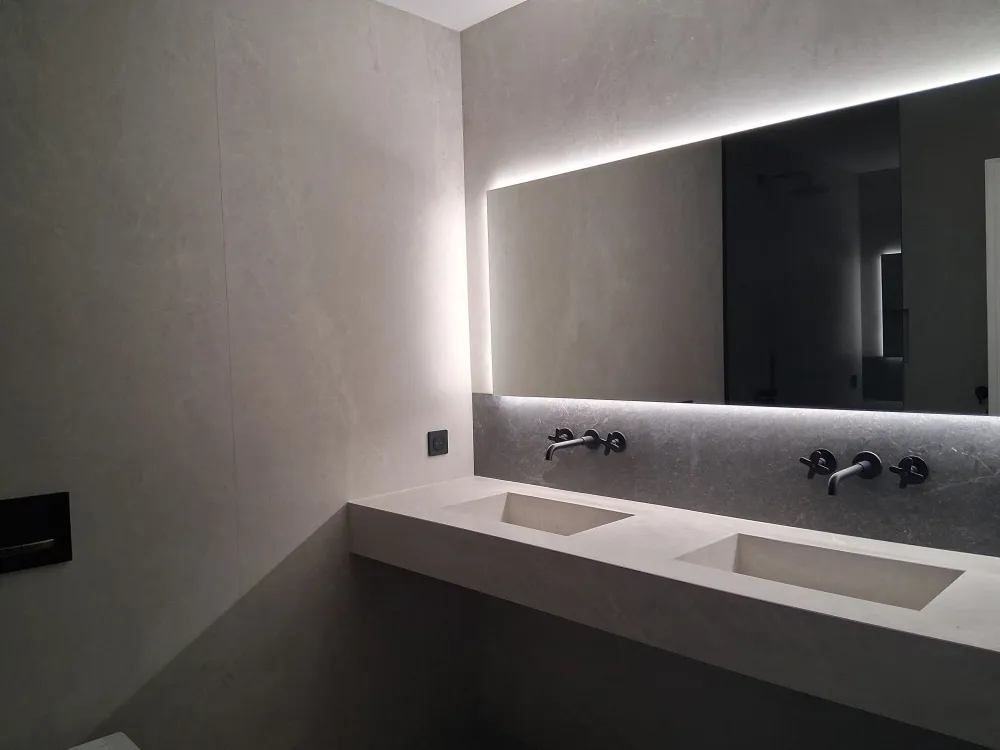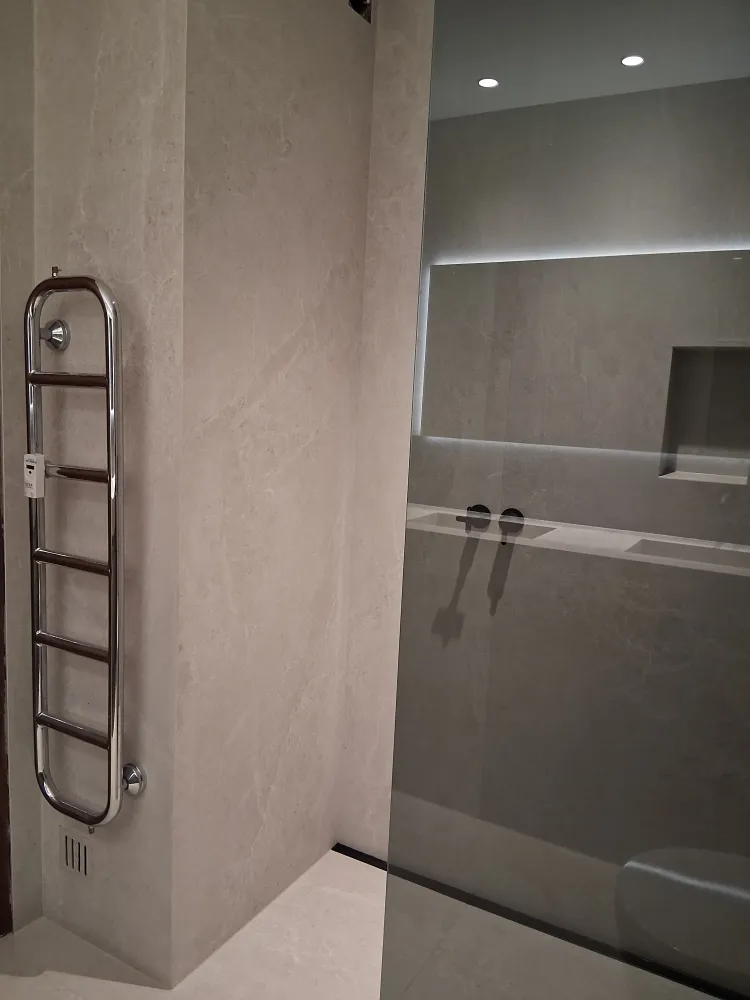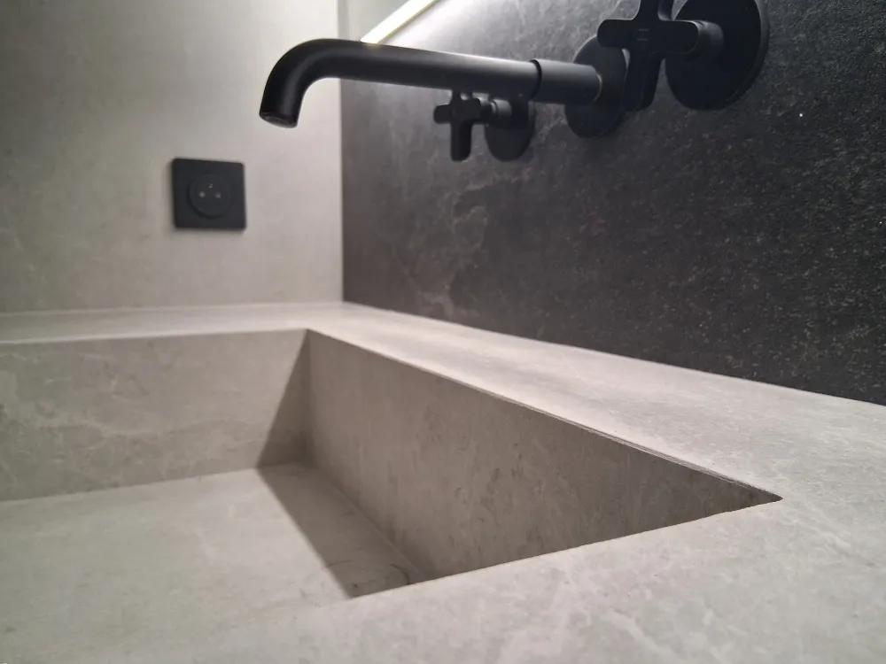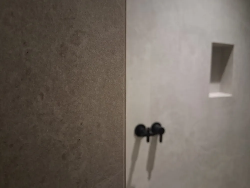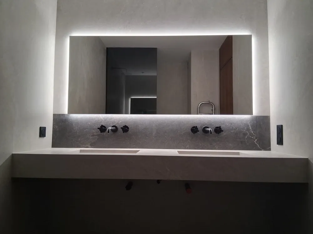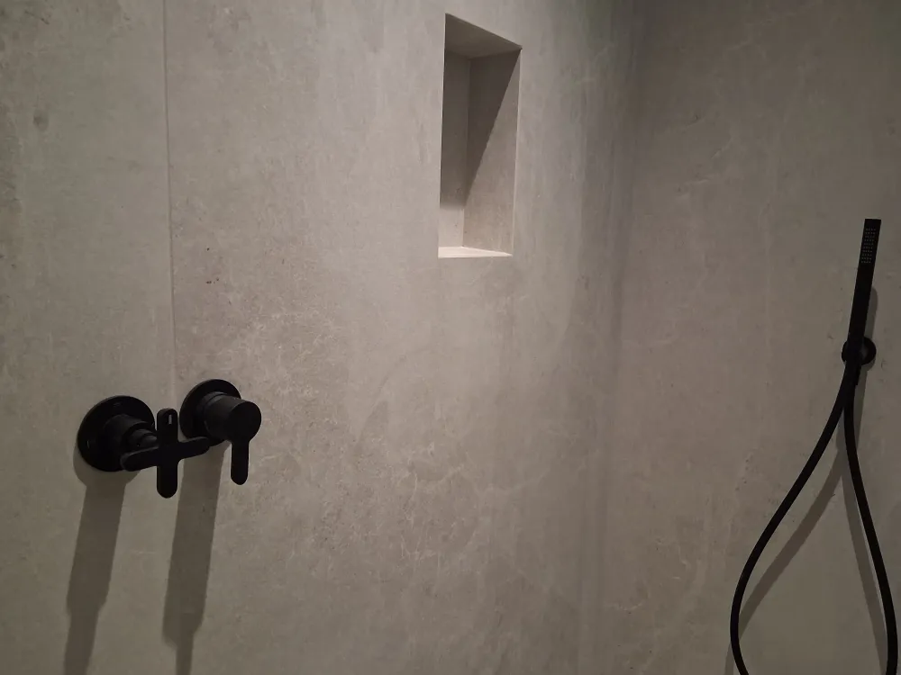 - Pose des carreaux au sol, au mur (compris niche). Coupes en onglet 45° réalisable selon format de carrelage et matière.